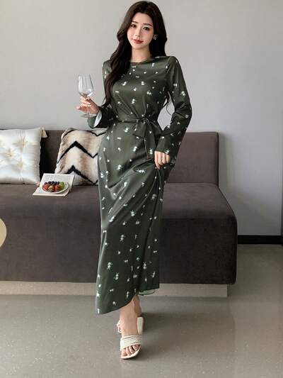 Charming Floral Allover Print Satin Long Waist Belt Cinched Women Nightgown-60%