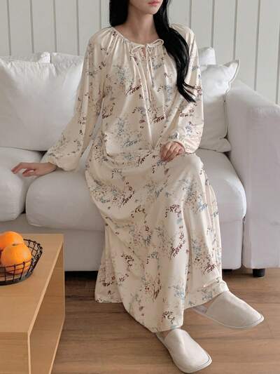Plant Pattern Full Print Ruched Drawstring Neck Lantern Sleeve Long Loose Women Nightgown