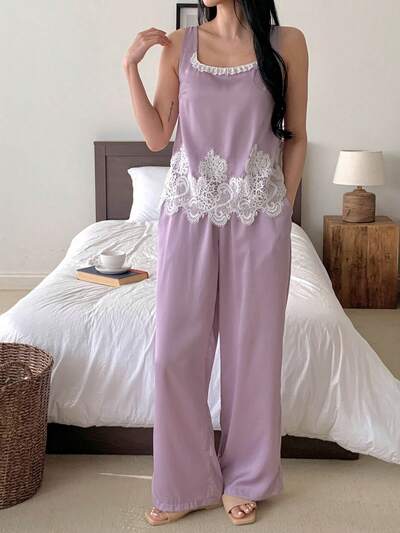 Women's Elegant Contrast Color Lace Patchwork Satin Camisole And Long Pants Pajama Set, Summer