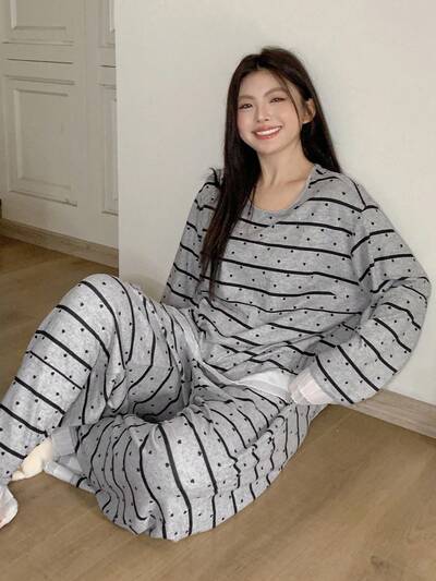 Dazy Plus Heart & Stripe Chiffon Mesh Patchwork Casual 2 Pieces Loungewear Set, Plus Size Women Spring/Autumn Pajamas, Fall Clothes-63%