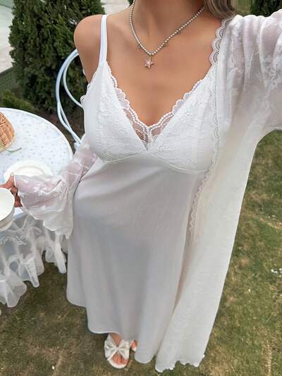 Summer French Romantic Lightweight Jacquard Robe Set, Lace Patchwork Camisole Nightgown Sleepwear For Women-30%