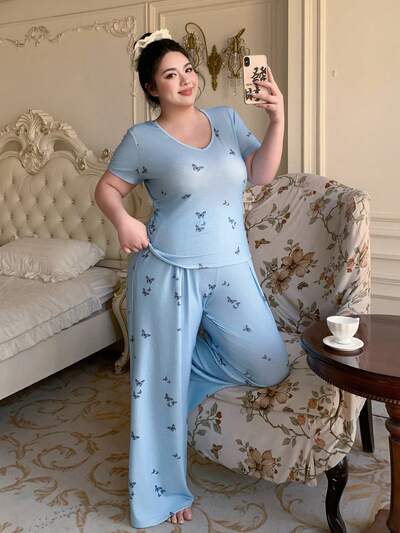 Dazy Plus Plus Size Comfortable Butterfly Print Short Sleeve T-Shirt And Pants Pajama Set, Summer-35%
