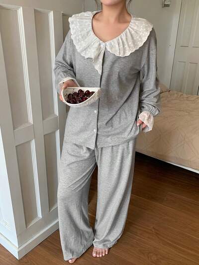 2pcs Contrast Lace Slim Fit Thermal Pajama Set, Women Pajamas For Autumn/Winter, Cozy Clothes-35%