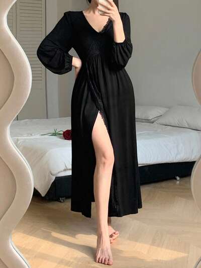 Charming Lace Patchwork Waist Slit Maxi Nightgown For Women Pajama, Winter-60%