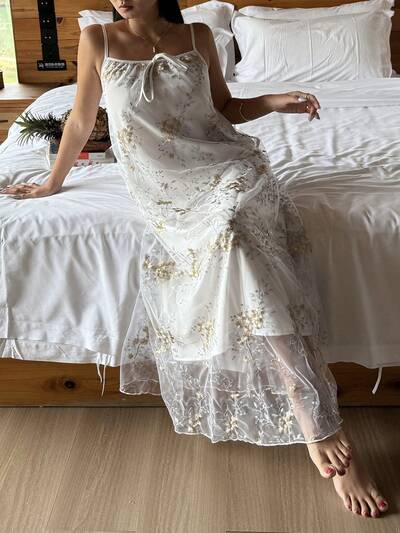 Summer Vacation Romantic Embroidered Mesh Loose Strap Women Nightgown-60%