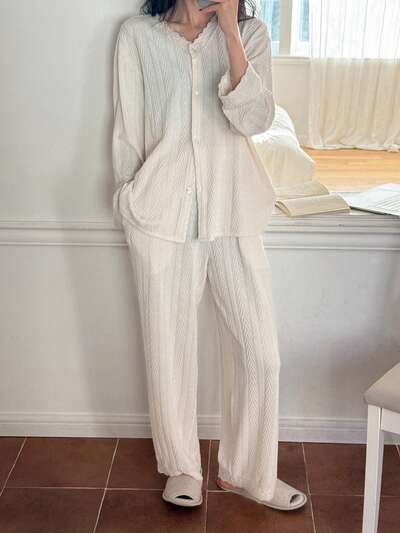 Soft Knit Jacquard & Lace Trim Loose Pajamas Set-52%