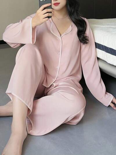 Dazy Plus Plus Size Solid Color Button Front Long Sleeve Top And Pants Pajama Set-20%