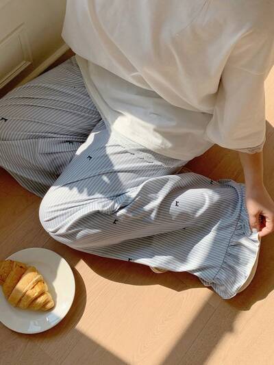 Minimalist Striped Knit V-Neck Top & Geometric Pattern Cropped Sleep Pants Women 2 Pieces Pajama Set-33%