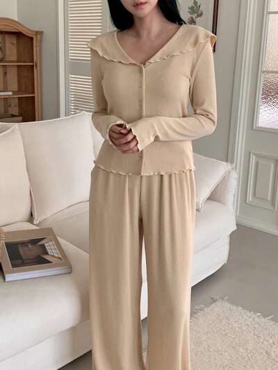 Knitted Sailor Collar Ruffle Trim Women Pajama Set-71%