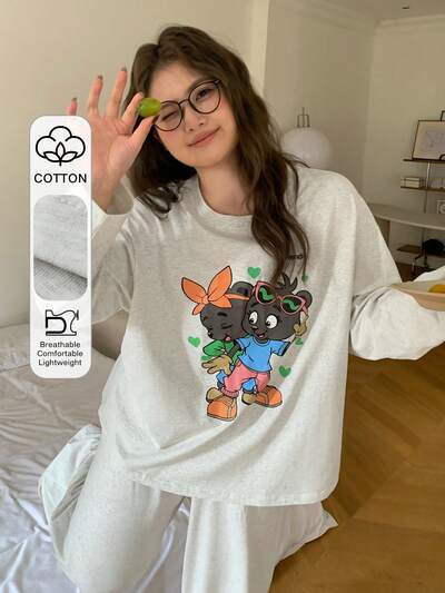 Dazy Plus Casual Cartoon Print Loose Long Sleeve Top And Straight Leg Pajama Pants Set, Plus Size, Spring/Autumn-37%
