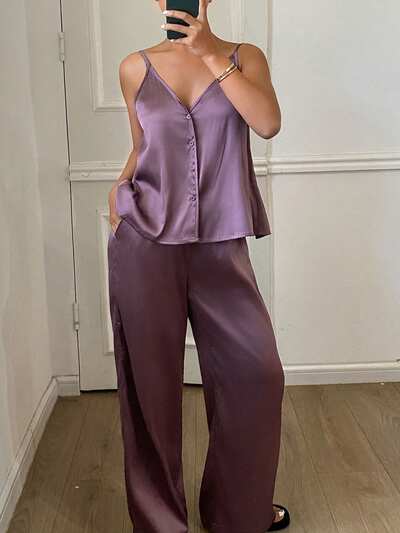 Women's Elegant Purple Satin Camisole And Pants Sleepwear Set-18%