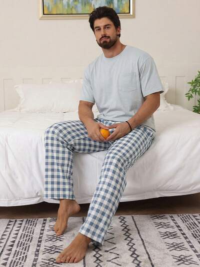 Men's Solid Color Short Sleeve T-Shirt And Pants Pajama Set, Spring/Summer-42%