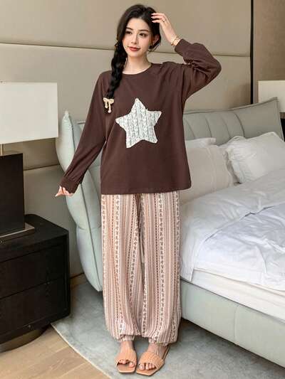 2pcs Women Lace Star Pattern Loose Long Sleeve & Long Pants Pajama Set, Autumn-42%