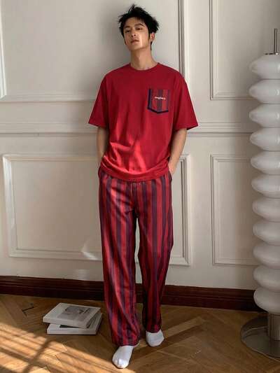 Red Short Sleeve Top And Pants Men's Pajama Set, Spring/Summer-38%