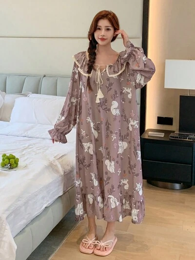 Cute Pattern Allover Print Ruffle Trim Relaxed Nightgown Pajama-63%