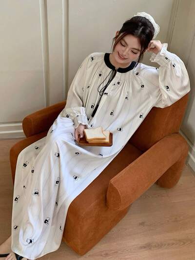 Dazy Plus Cartoon Print Loose Contrast Color Patchwork Drawstring Collar Long Sleeve Plus Size Women Nightgown-23%