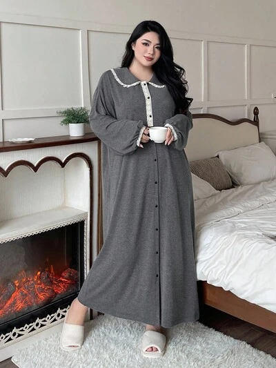 Dazy Plus Plus Size Women Peter Pan Collar Contrast Lace Half Open Front Loose Long Casual Nightgown, Spring/Autumn, For Fall, Winter-22%