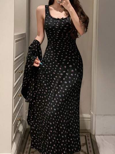 Ditsy Floral Lace Trim Fitted Maxi Nightgown For Women Pajama-32%