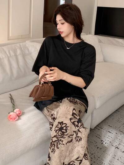 Women Spring/Summer New Solid Color Crew Neck Short Sleeve Top And Floral Pants Pajama Set-18%