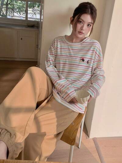 2pcs Women Loose Fit Cartoon Print Long Sleeve T-Shirt And Striped Pants Pajama Set-34%