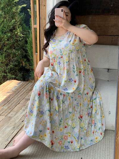 Dazy Plus Plus Size Floral Print Loose Long Nightdress , Casual Sleepwear, Moo Moo Night Dress-36%