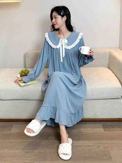 Contrast Trim Statement Collar Ruffle Hem Nightdress Pajama, For Fall, Winter, Moo Moo Night Dress-58%