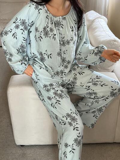 Elegant Floral Print Lantern Sleeve Loose Women Pajama Set-65%