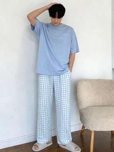 Men's Summer Letter Print T-Shirt And Plaid Pants Pajama Set-55%