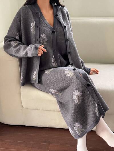 2pcs Knitted Long Sleeve Cardigan & Pinafore Dress Ditsy Floral Pajama Set For Women-57%