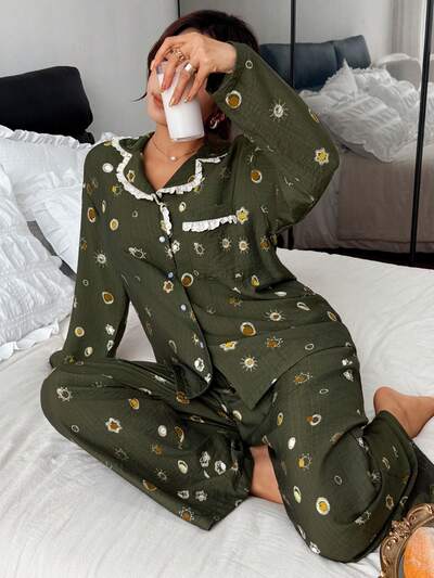 2pcs Women Ditsy Floral Round Neck Ruffle Patchwork Long Sleeve Top And Straight Leg Pants Pajama Set, Spring/Autumn-66%
