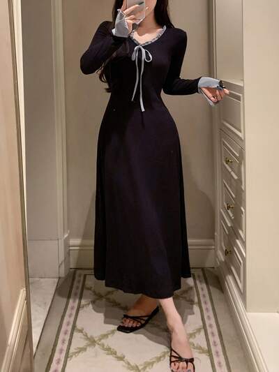 Women's Nightgown With Contrast Color Patchwork, Bowknot , And Slit Cuffs, Autumn/Winter, Fall Warm Sleep Dress-49%