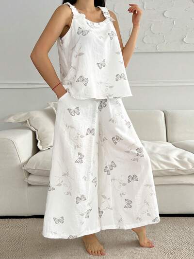 2pcs/Set Women Butterfly & Leaf Allover Print Sleeveless Loose Tank Top & Cropped Pants Pajamas Set,Back To School Clothes-19%
