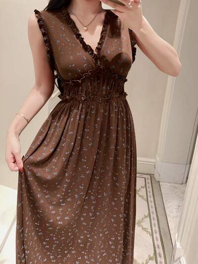 Ditsy Floral V-Neck Sleeveless Ruffle Hem Long Nightgown For Women-34%