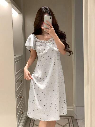 Satin Polka Dot Allover Print Lace Patchwork Ruffle Hem Women Nightgown-60%