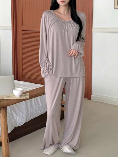 Relaxed Minimalist Knit Drawstring Collar Women Pajama Set-57%