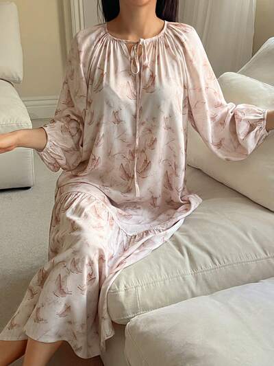 Autumn Butterfly Pattern Pleated Design Hollow Back Loose Lantern Sleeve Women Nightgown Pajama, Winter-35%