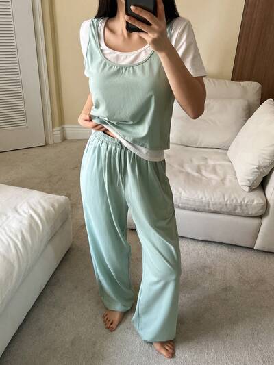 3-Piece Women Casual Camisole, T-Shirt & Pants Loungewear Set Pajama-71%