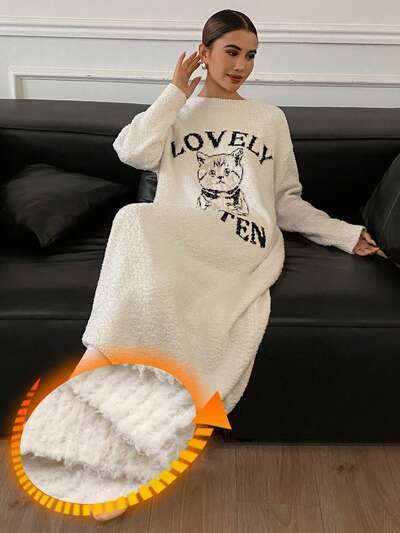 Loose Fit Cat Graphic Long Sleeve Knit Nightgown, Women Sleepwear Dress For Autumn/Winter, Moo Moo Night Dress-60%