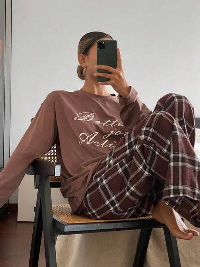 Letter Woven Label Decor Loose Plaid Women Pajama Set-60%