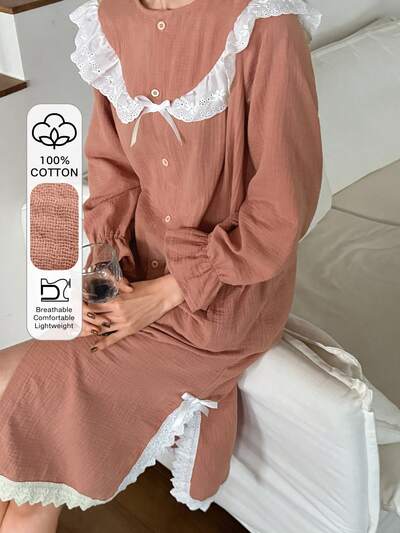 Sweet Tie Bow Contrast Color Embroidery Ruffle Trim Long Women Nightgown-56%