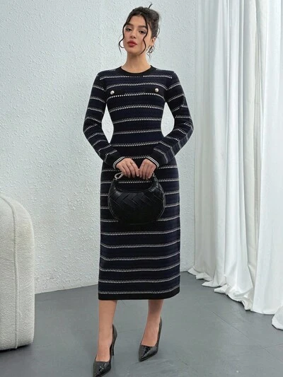Women's Elegant Commuter Striped Button Decor Sweater Dress, Autumn/Winter-35%