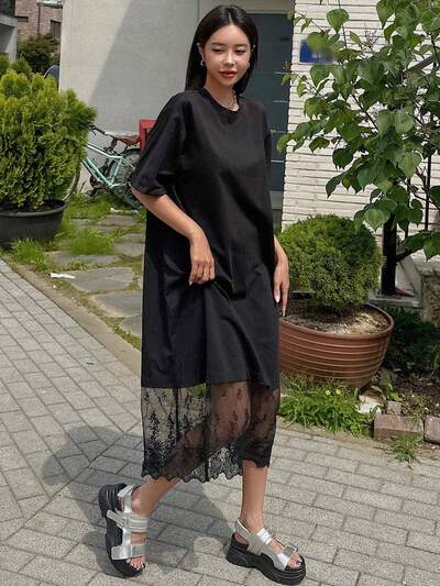 Lace Trimmed Loose Short Sleeve T-Shirt Dress For Women Summer Sundress,Casual Women Dresses Maxi Dress-32%
