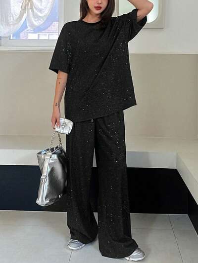 2pcs Women Casual Set: Round Neck Short Sleeve Top & Long Pants Lounge Sets For Women-45%