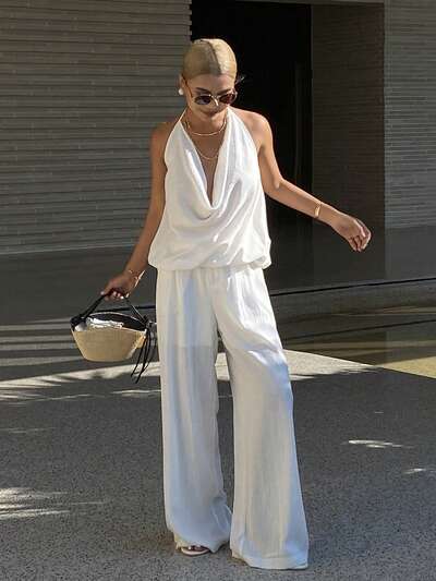 Women's Solid Color Spaghetti Strap Tie Cropped Backless Camisole And Straight Leg Pants Elegant Vacation Outfit, Spring/Summer 2-Piece Set-63%