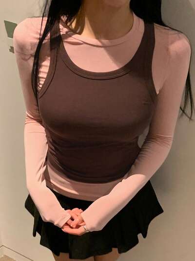 2pcs/Set Women Solid Color Crew Neck Long Sleeve T-Shirt And Sleeveless Casual Tank Top, Spring/Autumn-66%