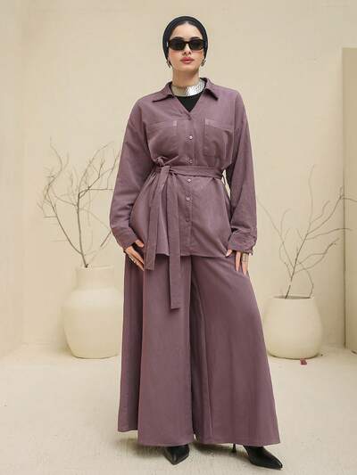 Women's Casual Solid Color Shirt & Wide Leg Pants 2 Pieces Set-31%