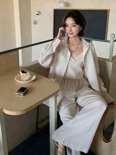 Women's Striped Drop Shoulder Long Sleeve Shirt, Camisole And Pants Casual Suit-60%
