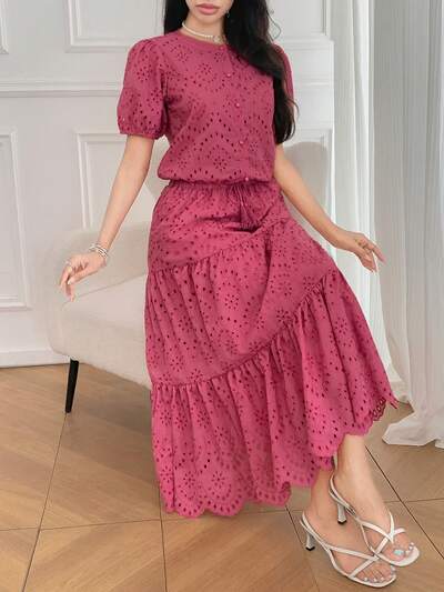 Women's 2 Pieces Set: Hollow-Out Embroidered Puff Sleeve Blouse And Skirt-31%