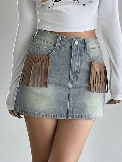 Women'S Contrast Color Fringed Decor Washed Denim Skirt Jeans Skirt-60%
