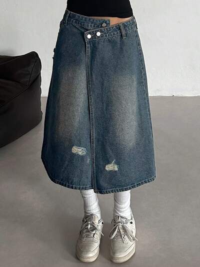 Women Retro Faded Asymmetrical Distressed Denim Skirt Jeans Skirt-60%